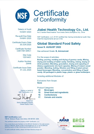 Группа здравоохранения в Jiabei с базами подпродукции Gangzhou и Heyuan имеет 8 липких линий, 16 капсульных наполнительных машин и 10 семинаров по упаковке с более чем 200 сотрудниками с 12 инженерами по исследованиям и разработкам. Мы специализируемся на пищевых добавках, таких как жевательные конфеты, капсулы, пероральные жидкости и белковые порошки с FDA GMP HACCP Halal BRCS и сертификаты FSSC22000. Наша годовая продукция достигает 1,5 миллионов килограммов жевательных газов, более 8 миллионов таблеток капсул и 2 миллиона бутылок пероральных жидкостей Наши клиенты включают